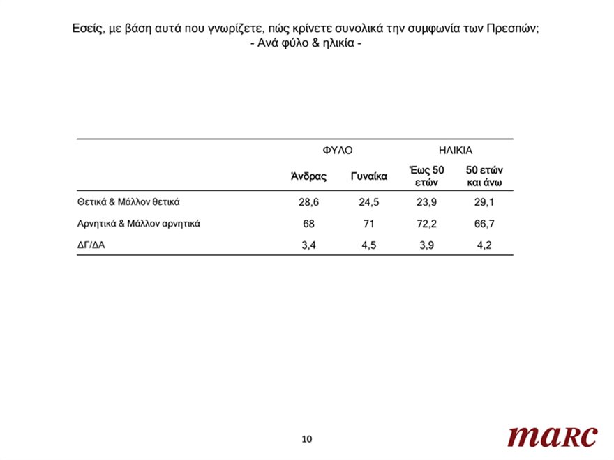 Εις ό,τι αφορά την ηλικιακή κατανομή, βαρύνουσας σημασίας θεωρείται και το γεγονός ότι οι Έλληνες μέχρι 50 ετών τοποθετούνται πιο αρνητικά απέναντι στη Συμφωνία των Πρεσπών σε σχέση με τις ηλικιακές ομάδες των πολιτών άνω των 50 ετών.