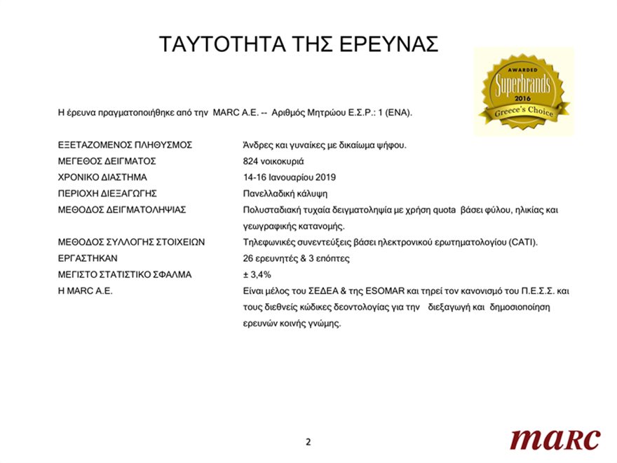 Πανελλαδική τηλεφωνική έρευνα της Marc σε 824 νοικοκυριά, άνδρες και γυναίκες με δικαίωμα ψήφου με πολυδιάστατη τυχαία δειγματοληψία βάσει φύλου, ηλικίας και γεωγραφικής κατανομής.