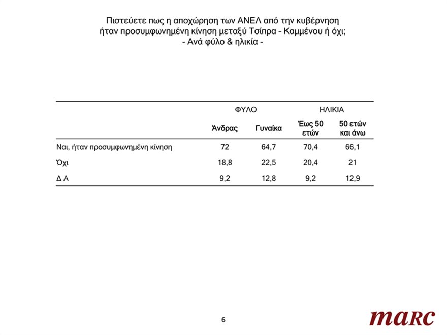 «Πιστεύετε πως η αποχώρηση των ΑΝΕΛ από την κυβέρνηση ήταν προσυμφωνημένη κίνηση μεταξύ Τσίπρα-Καμμένου ή όχι» είναι το επόμενο ερώτημα στο γκάλοπ της Marc με το 68,3% των πολιτών να απαντούν ότι επρόκειτο για προσυμφωνημένη κίνηση. «Όχι» απαντά στο ίδιο ερώτημα το 20,7% των συμμετεχόντων στην έρευνα ενώ το 11% επιλέγουν να πουν «δεν απαντώ».