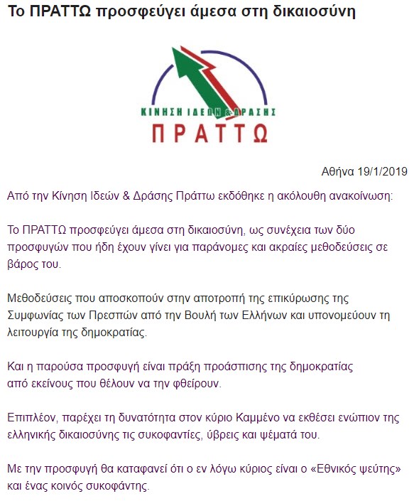 Στη Δικαιοσύνη προσφεύγει το ΠΡΑΤΤΩ, του Νίκου Κοτζιά, καταγγέλλοντας μεθοδεύσεις που «αποσκοπούν στην αποτροπή της επικύρωσης της Συμφωνίας των Πρεσπών από την Βουλή».