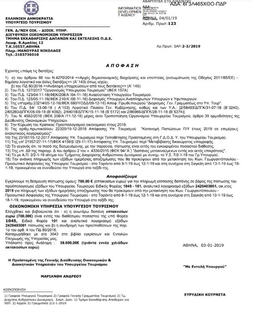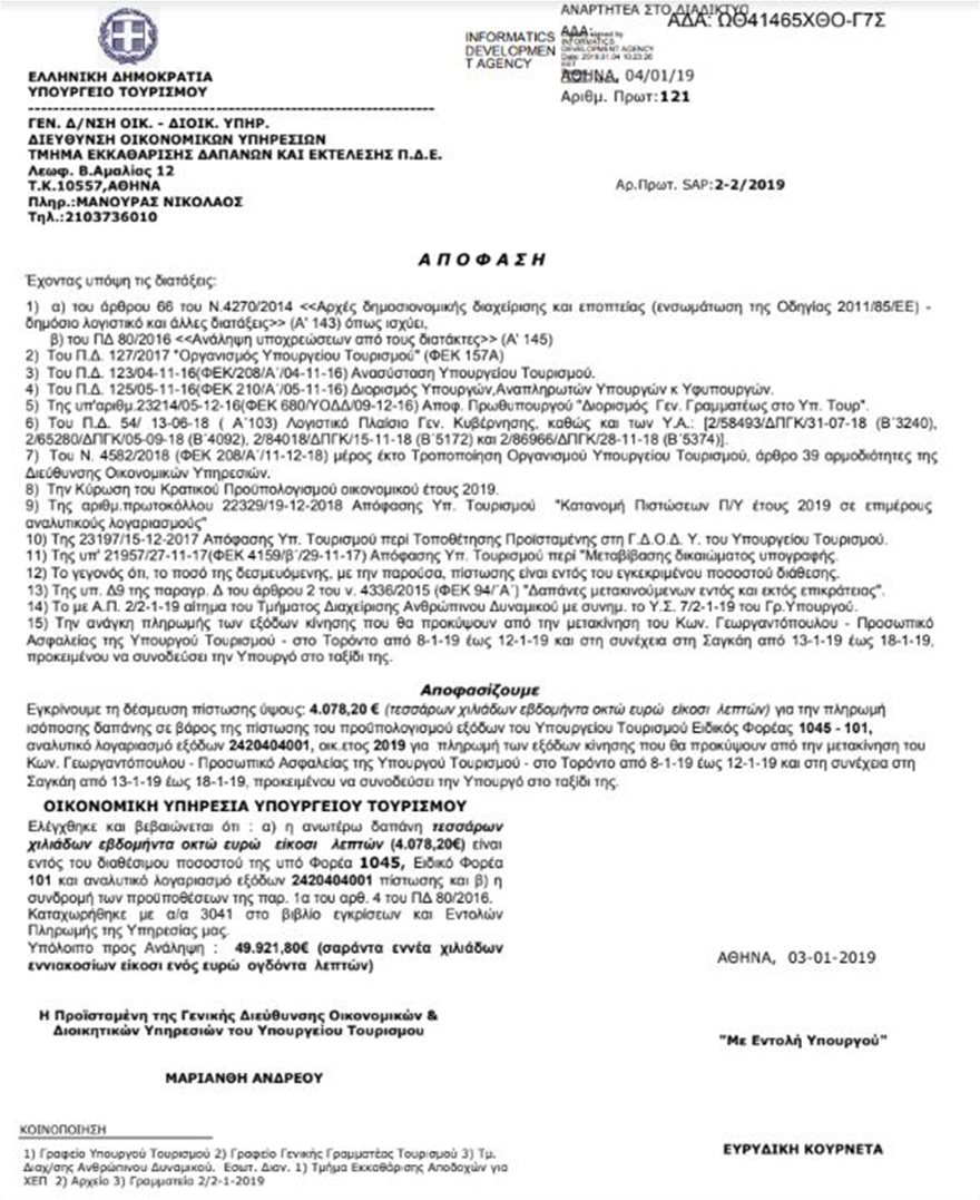 Σύμφωνα με την από 4 Ιανουρίου 2018 απόφαση της γενικής γραμματέα Τουρισμού Ευρυδίκης Κουρνέτα, “εγκρίνουμε τη δέσμευση πίστωσης ύψους: 21.056,40 ευρώ (είκοσι μίας χιλιάδων πενήντα έξι ευρώ σαράντα λεπτών) για την πληρωμή ισόποσης δαπάνης σε βάρος της πίστωσης του προΰπολογισμού εξόδων του Υπουργείου Τουρισμού Ειδικός Φορέας 1045 – 101, αναλυτικό λογαριασμό εξόδων 2420402001, οικ.ετος 2019 για Πληρωμή εξόδων από την μετακίνηση της Υπ.Τουρισμού Έλ. Κουντουρά στο Τορόντο από 8 -12/1/19 προκειμένου να συναντηθεί με τον ομόλογό της να κάνει επαφές με εταιρείες αερομεταφορών και στη συνέχεια θα μεταβεί στη Σαγκάη από 13-18/1/19 όπου θα εγκαινιάσει το Ελληνικό Περίπτερο στη Ζώνη ελεύθερου εμπορίου στη Σαγκάη.