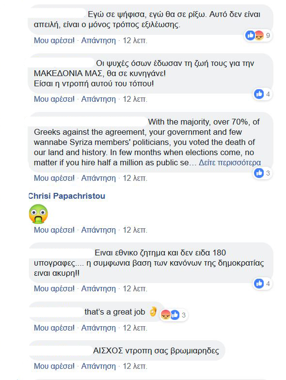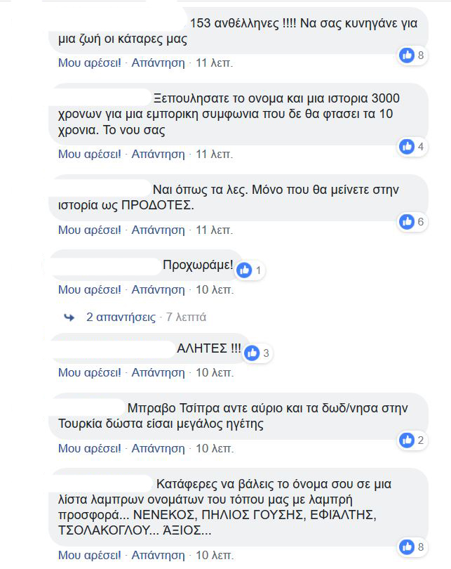 «Θα μείνετε στην ιστορία ως ΠΡΟΔΟΤΕΣ», «Να σας κηνυγάνε μια ζωή οι κατάρες μας», «Μόλις ξεκίνησε ο διαμελισμός της Ελλάδος», ήταν μερικά από τα χιλιάδες σχόλια των χρηστών.