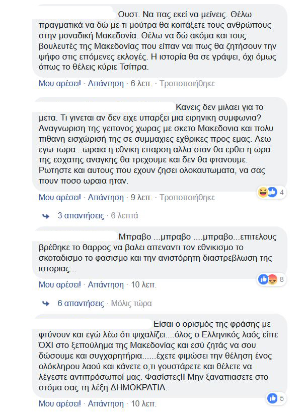 Aυτό είχε ως αποτέλεσμα δεκάδες χρήστες του facebook να «στολίσουν» με χαρακτηρισμούς και βρισιές τη δήλωση του πρωθυπουργού μετά την ψήφιση της Συμφωνίας των Πρεσπών από την Ολομέλεια της Βουλής.