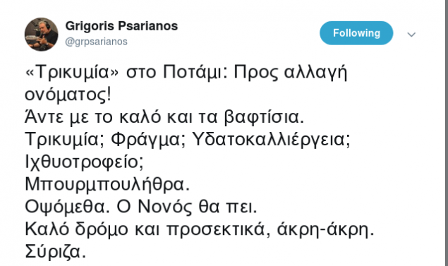 Με αρκετή δόση ειρωνείας σχολίασε ο Γρηγόρης Ψαριανός τις σκέψεις του Σταύρου Θεοδωράκη για αλλαγή ονομασίας στο Ποτάμι. Στο τέλος κάνει και μία νύξη για πιθανή συνεργασία του κόμματος του Σταύρου Θεοδωράκη με τον ΣΥΡΙΖΑ.