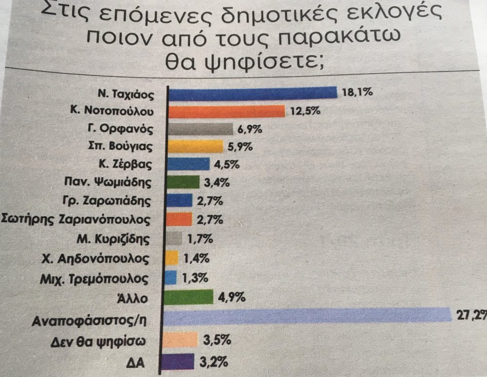 Κεφάλι στην κούρσα των δημοτικών εκλογών στη Θεσσαλονίκη παίρνει ο υποψήφιος της ΝΔ Νίκος Ταχιάος συγκεντρώνοντας ποσοστό 18,1% σύμφωνα με δημοσκόπηση της “Egnatia Point of view”.