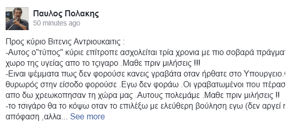 Σε ανάρτησή του στο Facebook o αναπληρωτής υπουργός Υγείας όχι μόνο δεν απολογείται για την πράξη του, υποστηρίζει ότι την φωτογραφία την τράβηξε κρυφά κάποιος εκπρόσωπος εταιρείας Υγειονομικου υλικού και κατηγορεί τον επίτροπο ότι δεν γνωρίζει το έργο που έχει επιτελέσει στο υπουργείο Υγείας.