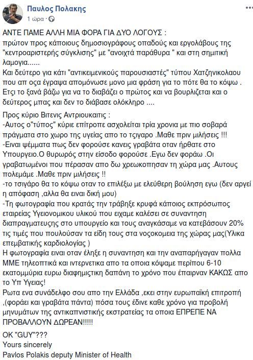 Ο κ. Πολάκης αναδημοσίευσε τη χθεσινή του ανάρτηση στην οποία μεταξύ άλλων απαντούσε στον Αντριουκάιτις ότι ασχολείται με πιο σοβαρά θέματα από το τσιγάρο και πως θα το κόψει όταν θέλει ο ίδιος, ενώ επιτέθηκε σε δημοσιογράφους, και ονομαστικά.