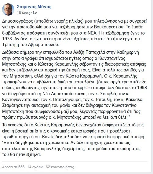 Με μια ανάρτησή του ο πρώην υπουργός Στέφανος Μάνος στο Facebook εξηγεί ποιος, κατά την άποψή του, είναι ο λόγος που η οικονομική πολιτική του Κώστα Καραμανλή κατέρρευσε.