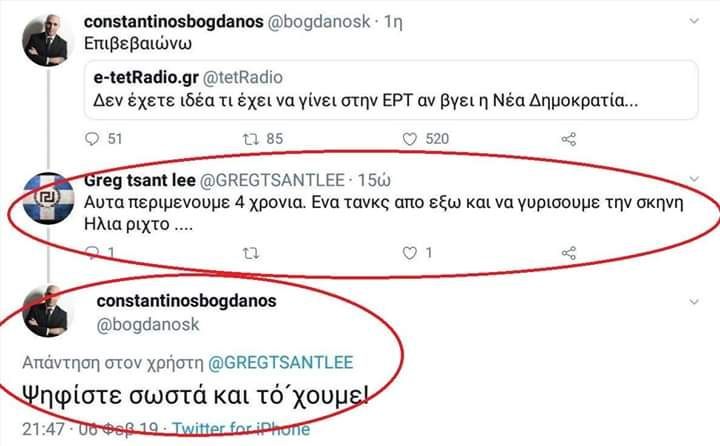 Με ένα ποστ στο twitter, ο Μπογδάνος παρακινεί τον κόσμο να ψηφίσει Νέα Δημοκρατία και υπόσχεται να γκρεμίσει το ραδιομέγαρο με τανκς.
