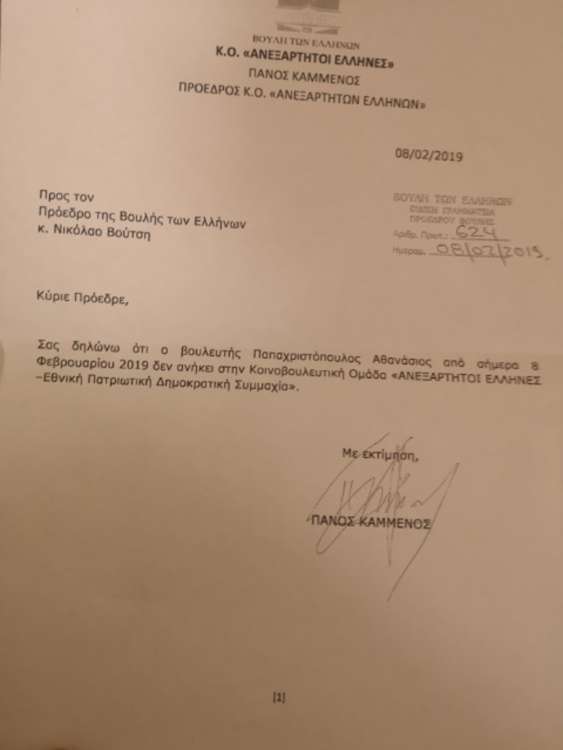 «Σας δηλώνω ότι ο βουλευτής Παπαχριστόπουλος Αθανάσιος από σήμερα 8 Φεβρουαρίου 2019 δεν ανήκει στην Κοινοβουλευτική Ομάδα Ανεξάρτητοι Έλληνες – Εθνική Πατριωτική Δημοκρατική Συμμαχία», αναφέρει στην επιστολή του ο κ. Καμμένος.