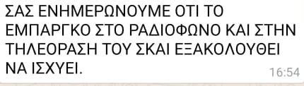 Με sms που εστάλη «αρμοδίως» στα κινητά των βουλευτών του ΣΥΡΙΖΑ από το μέγαρο Μαξίμου, τονίζεται πως ισχύει ακόμη η απόφαση του κόμματος να μην υπάρχει καμία τηλεοπτική ή ραδιοφωνική εμφάνιση στον ΣΚΑΪ.
