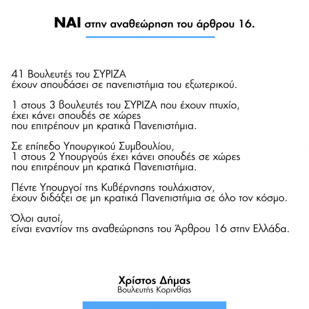 Πιο συγκεκριμένα, ο Αναπλ.Τομεράρχης Ανάπτυξης της ΝΔ, υπογράμμισε πως ««41 Βουλευτές του ΣΥΡΙΖΑ έχουν σπουδάσει σε πανεπιστήμια του εξωτερικού. 1 στους 3 βουλευτές του ΣΥΡΙΖΑ που έχουν πτυχίο, έχει κάνει σπουδές σε χώρες που επιτρέπουν μη κρατικά Πανεπιστήμια. Σε επίπεδο Υπουργικού Συμβουλίου, 1 στους 2 Υπουργούς έχει κάνει σπουδές σε χώρες που επιτρέπουν μη κρατικά Πανεπιστήμια. Πέντε Υπουργοί της Κυβέρνησης τουλάχιστον, έχουν διδάξει σε μη κρατικά Πανεπιστήμια σε όλο τον κόσμο».