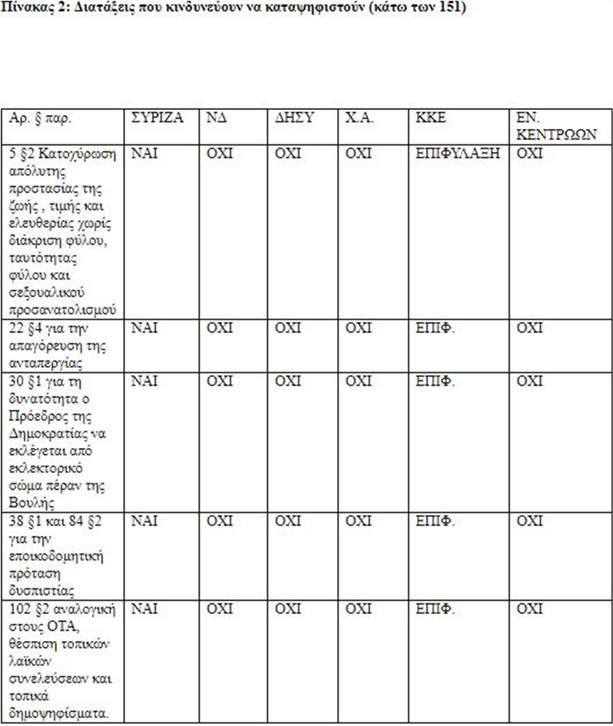 Απο την συζήτηση και τις γνωμοδοτικές τοποθετήσεις των κομμάτων στην αρμόδια επιτροπή που λειτούργησε το προηγούμενο διάστημα, από τις 149 προτάσεις μόλις οι 8 φαίνεται να συγκεντρώνουν την στήριξη ΣΥΡΙΖΑ και ΝΔ που είναι προϋπόθεση για να ξεπεραστεί το όριο των 180.