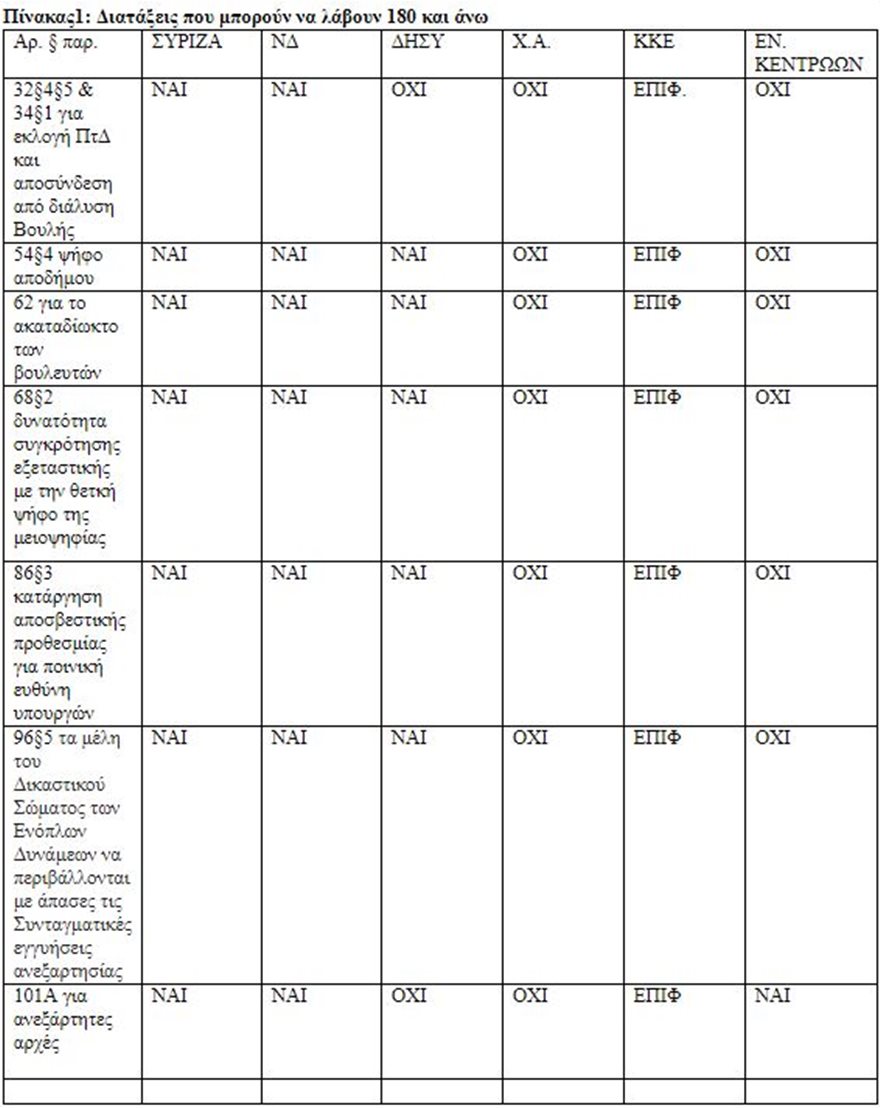 Απο την συζήτηση και τις γνωμοδοτικές τοποθετήσεις των κομμάτων στην αρμόδια επιτροπή που λειτούργησε το προηγούμενο διάστημα, από τις 149 προτάσεις μόλις οι 8 φαίνεται να συγκεντρώνουν την στήριξη ΣΥΡΙΖΑ και ΝΔ που είναι προϋπόθεση για να ξεπεραστεί το όριο των 180.