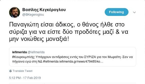 Με αφορμή την συνέντευξη του πρώην υπουργού του ΠΑΣΟΚ και κατόπιν υπουργού και βουλευτή του ΣΥΡΙΖΑ Παναγιώτη Κουρουμπλή ότι «υπάρχουν αντιδράσεις εντός του ΣΥΡΙΖΑ για τον Μωραΐτη, σαν να πήγαινα εγώ στη ΝΔ», ο γραμματέας της ΚΟ του Κινήματος Αλλαγής «έσφαξε» αμφοτέρους με μια ανάρτηση: «Παναγιώτη είσαι άδικος, ο θάνος ήλθε στο σύριζα για να είστε δύο προδότες μαζί & να μην νοιώθεις μοναξιά!» έγραψε στο twitter.