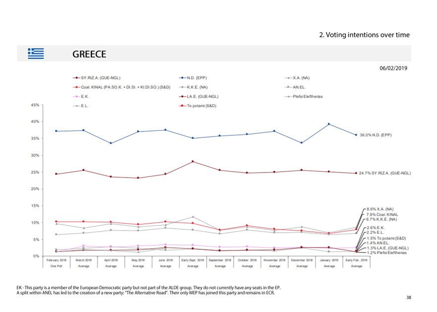 Έρευνα που διεξήγαγε το ευρωκοινοβούλιο ενόψει των ευρωεκλογών δείχνει όχι μόνο να προηγείται σταθερά η Νέα Δημοκρατία με ποσοστό 36% αλλά να έχει και μια διαφορά της τάξεως των έντεκα μονάδων από τον ΣΥΡΙΖΑ. Τρίτο κόμμα η Χρυσή Αυγή και πιο πίσω ακολουθούν το Κίνημα Αλλαγής και το ΚΚΕ.