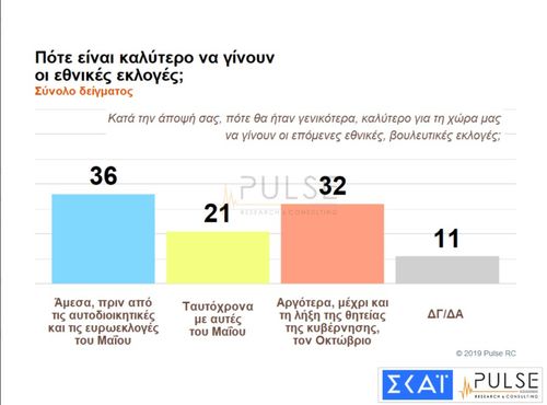 Επιπλέον, το 36% των ερωτηθέντων θεωρεί ότι οι εθνικές εκλογές πρέπει να διενεργηθούν άμεσα, δηλαδή πριν από τις αυτοδιοικητικές και τις ευρωεκλογές του Μαΐου ενώ το 32% θέλει ολοκλήρωση της κυβερνητικής θητείας. Όπως είναι αναμενόμενο, οι απαντήσεις στο ζήτημα σχετίζονται με την κομματική προτίμηση.