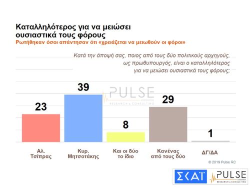 Ίσως πιο ενδιαφέρον πολιτικά είναι ότι το 39% θεωρεί καταλληλότερο να μειώσει τους φόρους τον Κυριάκο Μητσοτάκη, το 23% τον Αλέξη Τσίπρα και το 29% κανένας από τους δύο. Από τους ψηφοφόρους του ΣΥΡΙΖΑ του 2015 το 43% θεωρεί τον κ. Τσίπρα καταλληλότερο για να μειώσει τους φόρους, το 19% τον κ. Μητσοτάκη.