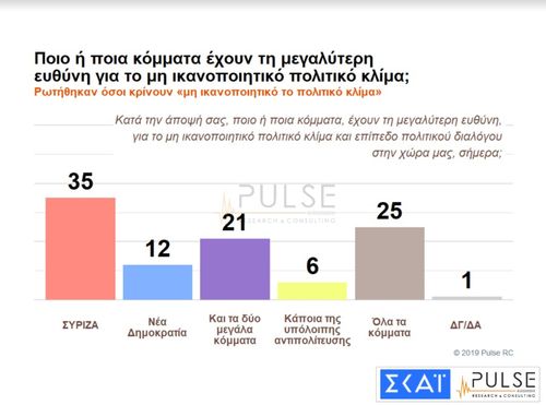Το 82% (αθροιστικά) απαντά «Μάλλον Όχι» και «Σίγουρα Όχι» στο ερώτημα εάν είναι ικανοποιημένο από το εν λόγω επίπεδο, ενώ το 35% επιρρίπτει στον ΣΥΡΙΖΑ την πρώτιστη ευθύνη, έναντι 12% που θεωρεί υπεύθυνη τη ΝΔ και 21% που θεωρεί υπεύθυνα αμφότερα τα μεγάλα κόμματα.