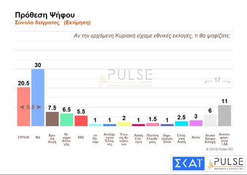 Προβάδισμα 11 μονάδων στη Νέα Δημοκρατία έναντι του ΣΥΡΙΖΑ με ταυτόχρονη άνοδο στην παράσταση νίκης καταγράφει δημοσκόπηση της εταιρίας Pulse για τον ΣΚΑΙ.