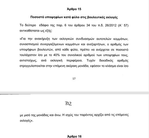 Με σχέδιο νόμου που κατέθεσε στη Βουλή το Υπουργείο Εσωτερικών, το οποίο εφόσον υπερψηφιστεί θα ισχύσει από τις επόμενες εκλογές, αναφέρει στο άρθρο 15 ότι ο αριθμός των υποψήφιων βουλευτών, από κάθε φύλο, πρέπει να ανέρχεται σε ποσοστό τουλάχιστον ίσο με το 40% του συνολικού αριθμού των υποψηφίων τους, αντιστοίχως, ανά εκλογική περιφέρεια.