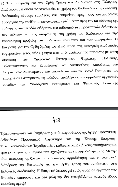 Η Επιτροπή συγκροτείται εντός 1 μήνα από τη δημοσίευση του παρόντος με κοινή απόφαση των Υπουργών Εσωτερικών, Ψηφιακής Πολιτικής, Δικαιοσύνης και αποτελείται από το Γενικό Γραμματέα του υπουργείου εσωτερικών, ως πρόεδρο, υπαλλήλους των αρμόδιων οργανικών μονάδων των υπουργείων Εσωτερικών και Ψηφιακής Πολιτικής, εκπροσώπους της Εθνικής Επιτροπής Τηλεπικοινωνιών, της ανεξάρτητης αρχής για την προστασία προσωπικών δεδομένων και ειδικούς επιστήμονες και εμπειρογνώμονες»