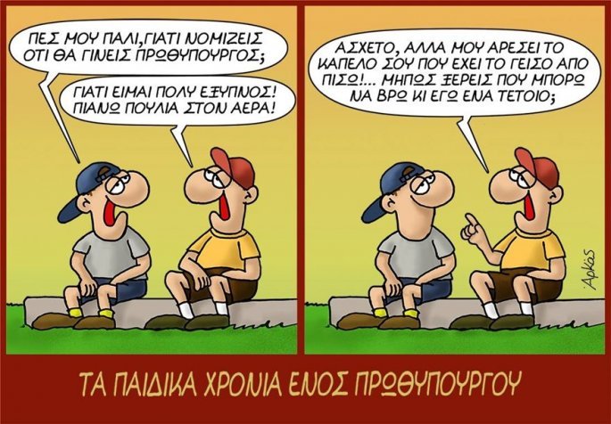 Συνεχίζει ακατάπαυστος ο Αρκάς και μας παρουσιάζει τις νέες περιπέτειες από τα “παιδικά χρόνια ενός πρωθυπουργού”, με την την χαρακτηριστική κίτρινη μπλούζα και το καφέ σορτσάκι.