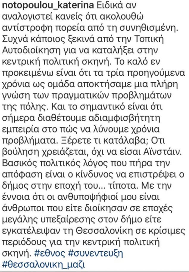 Τώρα ξαναχτύπησε. Γράφοντας στο Instagram για τους πολιτικούς της αντιπάλους ότι διοίκησαν τον Δήμο «σε εποχές μεγάλης υπεξαίρεσης». Εποχές υπεξαίρεσης δεν υπάρχουν. Υποθέτουμε θέλει να πεί σε εποχές που αποκαλύφθηκε η υπεξαίρεση των χρημάτων από τα ταμεία του Δήμου Θεσσαλονίκης, αλλά το είπε λίγο συνοπτικά. Εγραψε πάλι στο Instagram: