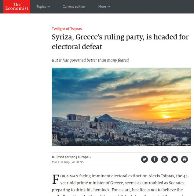 O Economist αναφέρεται στο τέλος της κυβέρνησης ΣΥΡΙΖΑ που έρχεται, ενώ ασκεί δριμεία κριτική στον Αλέξη Τσίπρα τον οποίο θεωρεί ότι απλώς ετοιμάζεται για την πολιτική του αυτοκτονία στις εθνικές εκλογές.