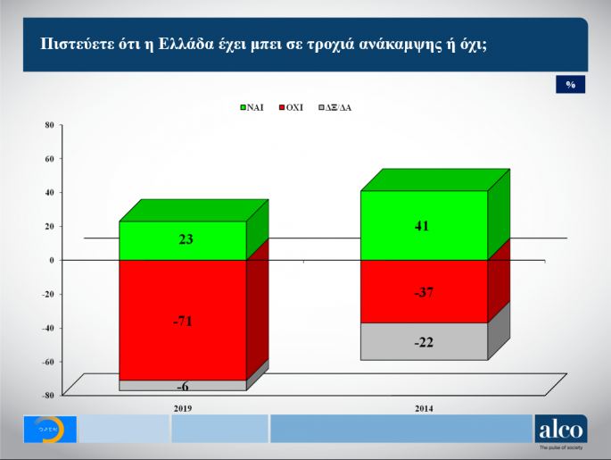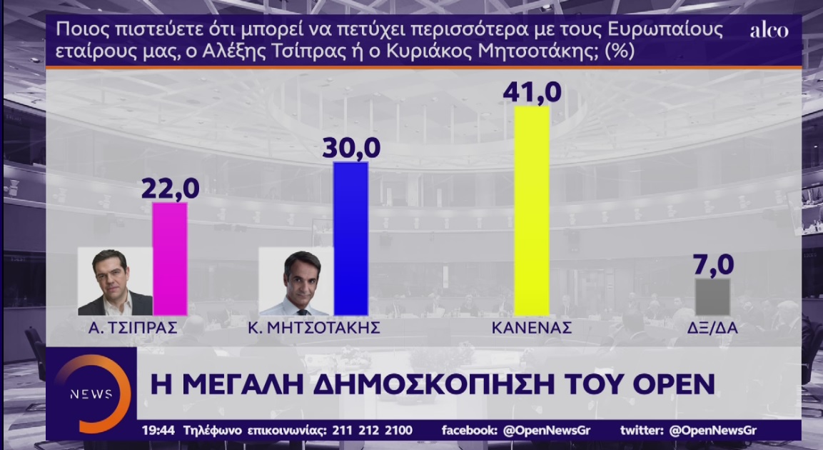Στο ερώτημα «ποιος πιστεύετε ότι μπορεί να πετύχει περισσότερα με τους Ευρωπαίους εταίρους, ο Τσίπρας ή ο Μητσοτάκης;», το 30% λέει ο Μητσοτάκης, 22% απαντά ο Τσίπρας και 41% εκτιμά ο… «κανένας».