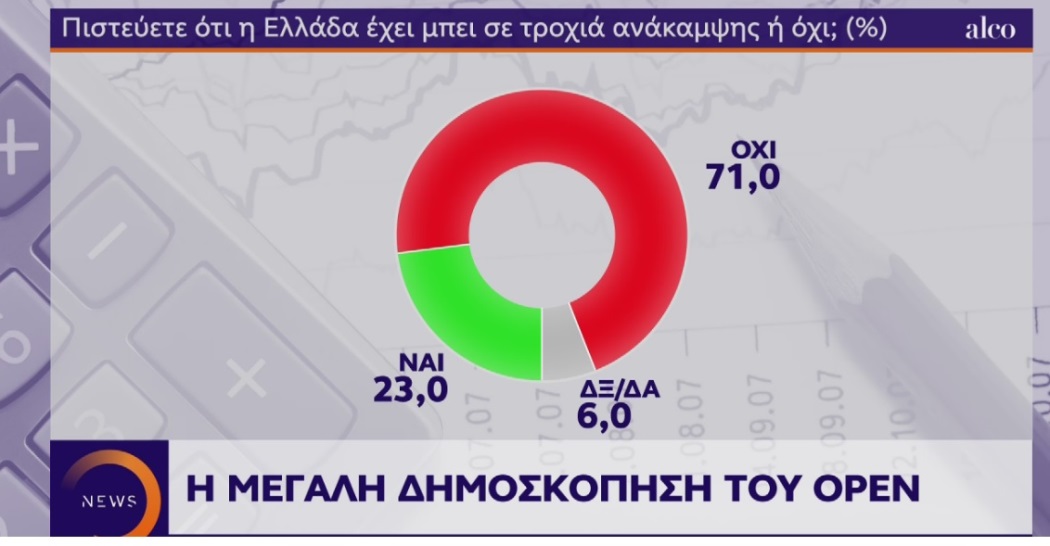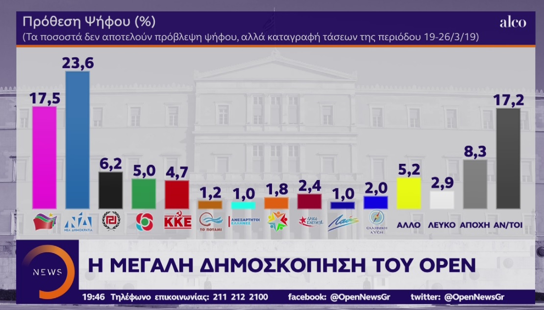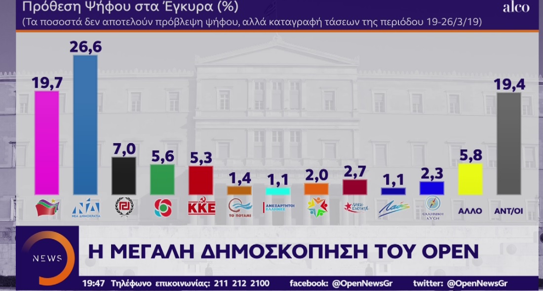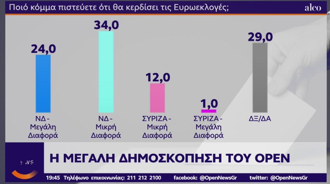 Προβάδισμα στη Νέα Δημοκρατία εν όψει των Ευρωεκλογών δίνει δημοσκόπηση της Alco για λογαριασμό του τηλεοπτικού σταθμού OPEN η οποία παρουσιάστηκε στο κεντρικό δελτίο του σταθμού.