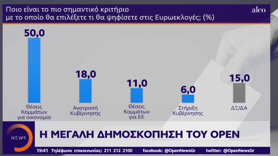 Όσον αφορά στα κριτήρια με τα οποία θα ψηφίσουν στις Ευρωεκλογές, οι μισοί από τους ερωτηθέντες προτάσσουν τις θέσεις των κομμάτων για την οικονομία, με ένα 18% να ψηφίζει με κριτήριο την ανατροπή της κυβέρνησης, ένα 11% με κριτήριο της θέσεις των κομμάτων για την Ευρωπαϊκή Ένωση και ένα 6% με κριτήριο τη στήριξη της κυβέρνησης.