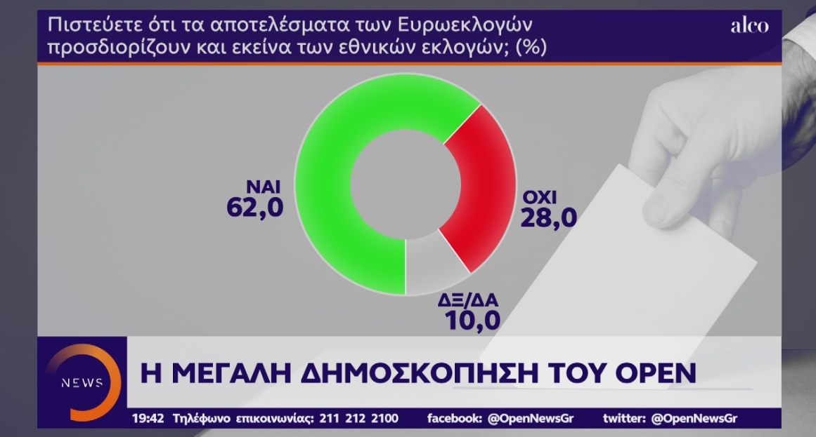 Εξάλλου, το 62% των ερωτηθέντων θεωρούν πως το αποτέλεσμα των Ευρωεκλογών προσδιορίζει και εκείνο των εθνικών εκλογών, έναντι 28% που διαφωνούν. Όσον αφορά στην παράσταση νίκης, το 58% βλέπει νίκη της Νέας Δημοκρατίας στις Ευρωεκλογές, ενώ το 13% νίκη του ΣΥΡΙΖΑ.