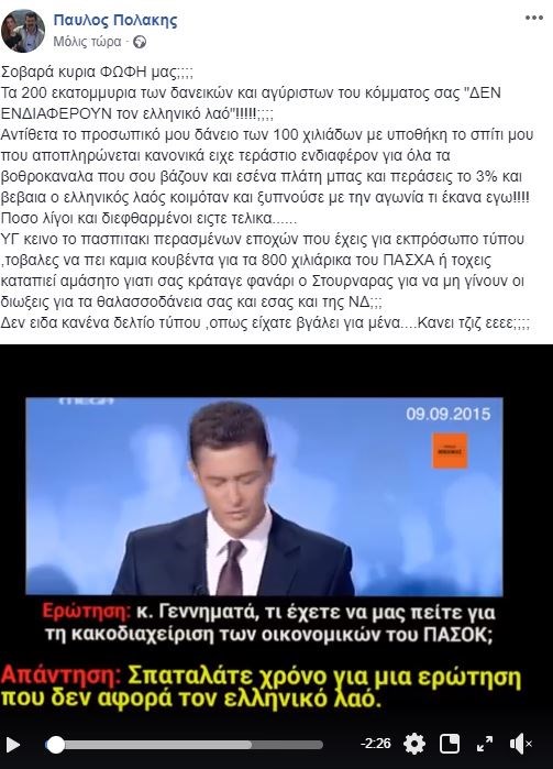 Μάλιστα, ο κ. Πολάκης σχολιάζει το βίντεο αυτό λέγοντας : «Σοβαρά κυρία Φώφη μας; Τα 200 εκατομμύρια των δανεικών και αγύριστων του κόμματος σας «δεν ενδιαφέρουν τον ελληνικό λαό»; Αντίθετα, το προσωπικό μου δάνειο των 100 χιλιάδων με υποθήκη το σπίτι μου που αποπληρώνεται κανονικά είχε τεράστιο ενδιαφέρον για όλα τα βοθροκάναλα που σου βάζουν και εσένα πλάτη μπας και περάσεις το 3% και βέβαια ο ελληνικός λαός κοιμόταν και ξυπνούσε με την αγωνία τι έκανα εγώ! Πόσο λίγοι και διεφθαρμένοι είστε τελικά…».