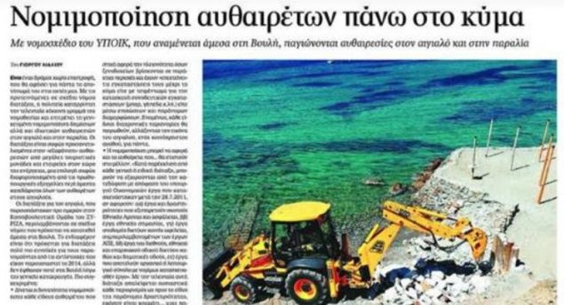 Κατά το ίδιο δημοσίευμα, «για τη νομιμοποίηση των αυθαιρέτων σε αιγιαλό και παραλία, αλλά και σε παρόχθια ζώνη ποταμού ή λίμνης, αρκεί μια απλή απόφαση του υπουργού Οικονομικών και του εκάστοτε συναρμόδιου υπουργού – ανάλογα με το είδος της δραστηριότητας που αφορά η αυθαίρετη κατασκευή».