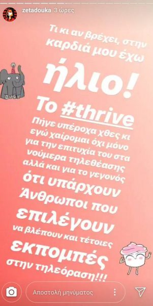 «Τι κι αν βρέχει; Στην καρδιά μου έχω ήλιο. Το Thrive πήγε υπέροχα χθες κι εγώ χαίρομαι όχι μόνο για την επιτυχία του στα νούμερα τηλεθέασης, αλλά και για το γεγονός ότι υπάρχουν άνθρωποι που επιλέγουν να βλέπουν και τέτοιες εκπομπές στην τηλεόραση».