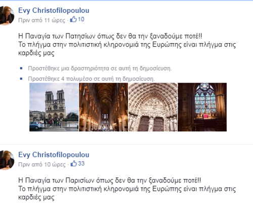 Τη στιγμή που η φωτιά μαινόταν στην εκκλησία της Παναγίας των Παρισίων η Εύη Χριστοφιλοπούλου, όπως και άλλοι Έλληνες πολιτικοί, εξέφρασαν τη θλίψη τους και την ταυτόχρονη συμπαράστασή τους στο γαλλικό λαό. Απλά εκεί έκανε ένα λαθάκι.