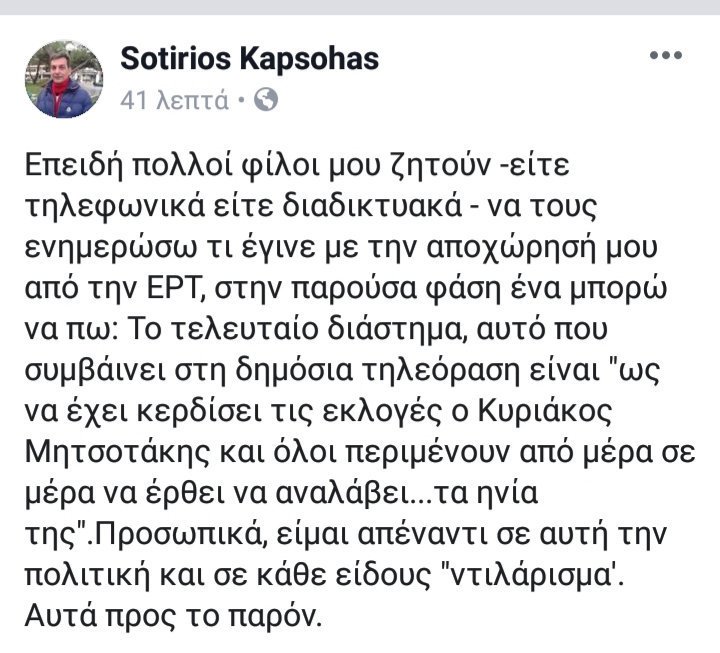Με σημερινή ανάρτησή του στο facebook ο σχολιαστής επιχειρεί έμμεσα να ρίξει τις ευθύνες για την απόλυσή του από το κρατικό κανάλι στο μεταβατικό κλίμα που επικρατεί εν όψει της …εκλογικής νίκης της ΝΔ!