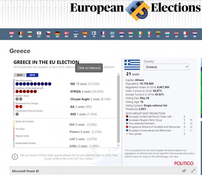 Την ίδια στιγμή σε ευρωπαϊκό επίπεδο το Ευρωπαϊκό Λαϊκό Κόμμα, προηγείται σύμφωνα με το Politico το ΕΛΚ κερδίζει 176 έδρες, οι σοσιαλδημοκράτες 147, οι Φιλελεύθεροι 99 έδρες, οι Ευρωπαίοι Συντηρητικοί και Ρεφορμιστές (ECR) 63 έδρες, οι Πράσινοι 55 έδρες, Νέα Κόμματα 49 έδρες, η Συμμαχία του Σαλβίνι, 49 έδρες, η Ευρωπαϊκή Αριστερά (στην οποία συμμετέχει και η ομάδα του ΣΥΡΙΖΑ) με 48 έδρες, η Ευρώπη των Εθνών και της Ελευθερίας 33 έδρες, το Κίνημα των Πέντε Αστέρων 21 έδρες και τέλος οι μη εγγεγραμμένοι 11 έδρες.