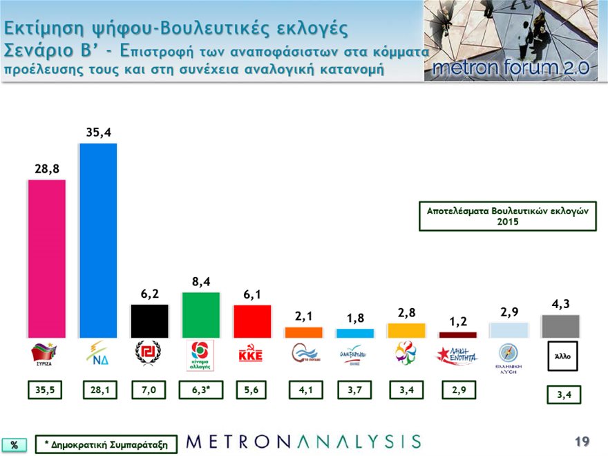 Στο σενάριο της επιστροφής των αναποφάσιστων στα κόμματα που είχαν επιλέξει το 2015 και αναλογική κατανομή τους στη συνέχεια, τα ποσοστά αναδιαμορφώνονται ως εξής: ΝΔ 35,4%, ΣΥΡΙΖΑ 28,8%, ΚΙΝΑΛ 8,4%, ΧΑ 6,2%, ΚΚΕ 6,1%. Στο σενάριο αυτό η βουλή θα είναι πεντακομματική με την εξής κατανομή εδρών: ΝΔ: 154, ΣΥΡΙΖΑ 85, ΚΙΝΑΛ 25, ΧΑ 18, ΚΚΕ 18. Εκτός βουλής μένει στο σενάριο αυτό η Ελληνική Λύση.