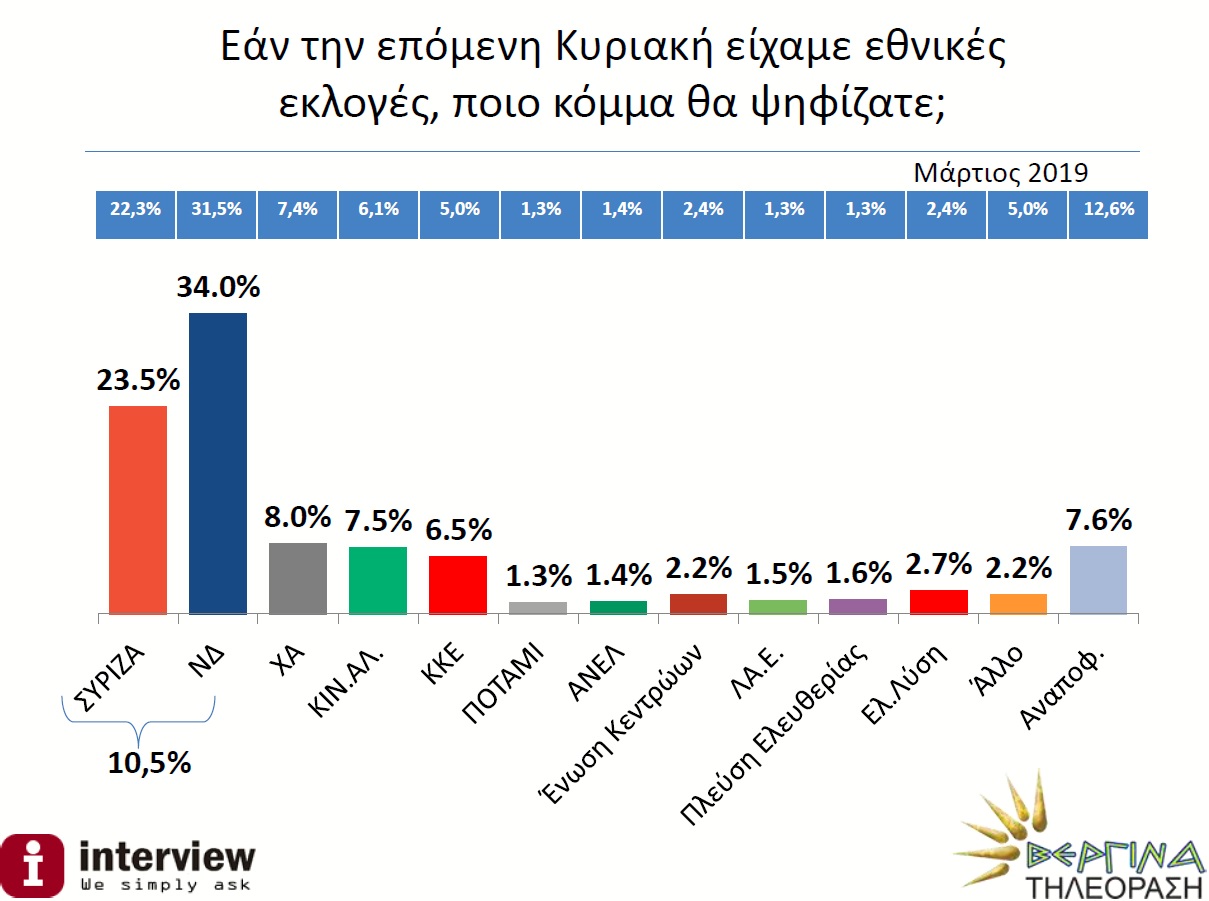 Με μεγάλη διαφορά 13,7 μονάδων προηγείται η ΝΔ έναντι του ΣΥΡΙΖΑ στις ευρωεκλογές, σύμφωνα με τη δημοσκόπηση της εταιρείας Interview για λογαριασμό του καναλιού Βεργίνα TV. Ταυτόχρονα, στις εθνικές εκλογές, η διαφορά πέφτει μεν, ανέρχεται ωστόσο και πάλι σε διψήφιο ποσοστό (10,5%).