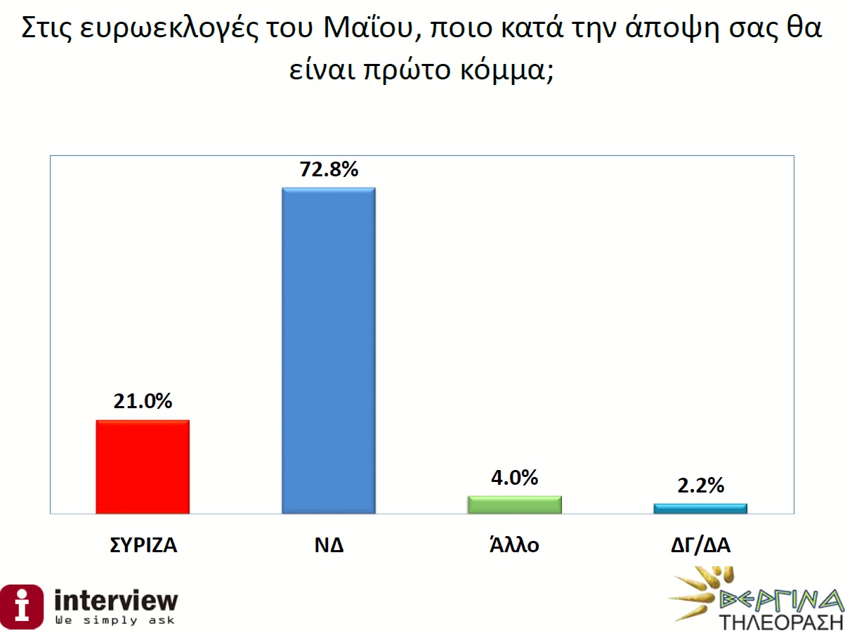 Στην παράσταση νίκης στις ευρωεκλογές, δε, η ΝΔ προηγείται με 72,8% έναντι 21% του ΣΥΡΙΖΑ. Άλλο κόμμα απαντούν το 4% των ερωτηθέντων, ενώ 2,2% δηλώνει δεν ξέρω/δεν απαντώ.