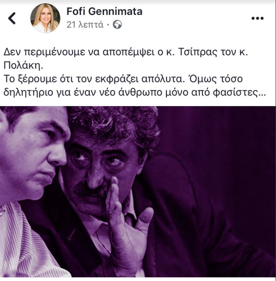 «Δεν περιμένουμε να αποπέμψει ο κ. Τσίπρας τον κ. Πολλάκη. Το ξέρουμε ότι τον εκφράζει απόλυτα», δήλωσε η Φώφη Γεννηματά, καταδικάζοντας της αναφορές του αναπληρωτή υπουργού Υγείας στον Στέλιο Κυμπουρόπουλο.