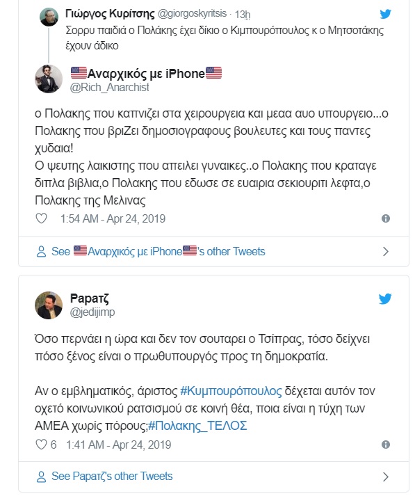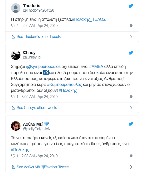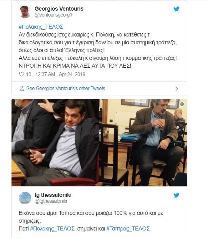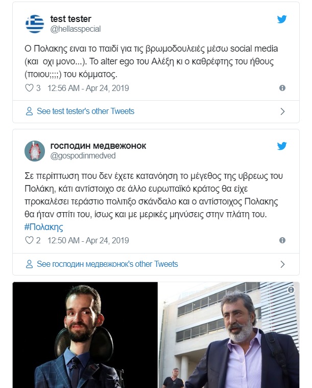 «Η στήριξη είναι η απόλυτη ξεφτίλα» γράφει κάποιος χρήστης του Twitter, με έναν δεύτερο να παρατηρεί ότι ο Πολάκης είναι «το alter ego του Αλέξη κι ο καθρέφτης του ήθους (ποιου;;;;) του κόμματος» και έναν τρίτο να σχολίαζει «όσο περνάει η ώρα και δεν τον σουταρει ο Τσίπρας, τόσο δείχνει πόσο ξένος είναι ο πρωθυπουργός προς τη δημοκρατία».