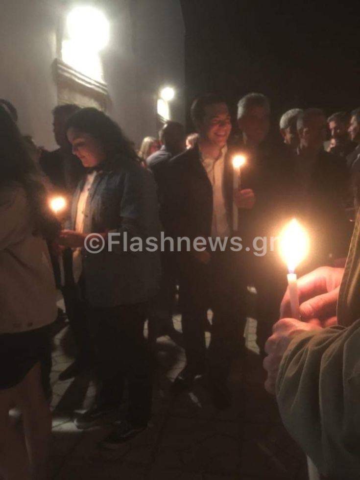 Ο πρωθυπουργός παρακολούθησε την θεία λειτουργία κρατώντας ένα λευκό κερί και όταν ο ιερέας έψαλε το «Χριστός Ανέστη» έδωσε το φιλί της αγάπης στην Περιστέρα Μπαζιάνα που βρισκόταν δίπλα του.