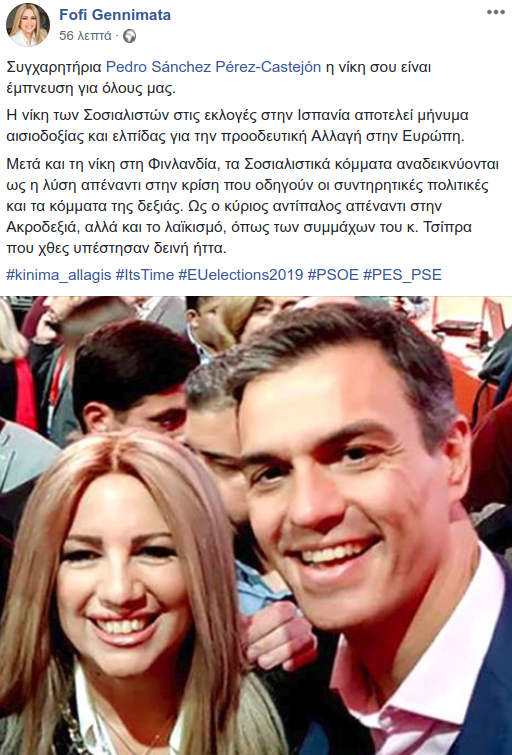 ”Συγχαρητήρια Πέδρο η νίκη σου είναι έμπνευση για όλους μας. Η νίκη των Σοσιαλιστών στις εκλογές στην Ισπανία αποτελεί μήνυμα αισιοδοξίας και ελπίδας για την προοδευτική Αλλαγή στην Ευρώπη» έγραψε αρχικά η επικεφαλής του ΚΙΝΑΛ σχολιάζοντας την νίκη των σοσιαλιστών στην Ισπανία.