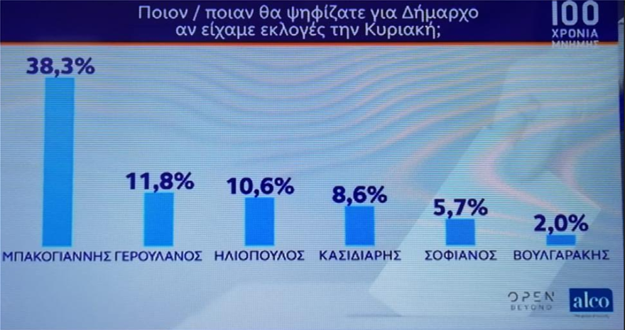 Ο Κώστας Μπακογιάννης, στην ερώτηση ποιον θα ψηφίζατε για δήμαρχο αν είχαμε εκλογές την Κυριακή, συγκεντρώνει ποσοστό 38,3%.