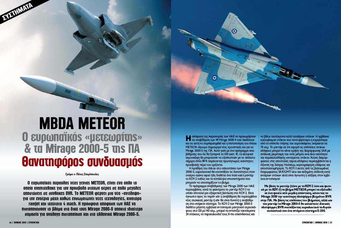 Ο ευρωπαϊκός πύραυλος νέας γενιάς METEOR, είναι ένα όπλο το οποίο αναπτύχθηκε για την προσβολή στόχων αέρος σε πολύ μεγάλες αποστάσεις σε συνθήκες BVR. Το METEOR φέρνει μια νέα «αντίληψη» για την εναέρια μάχη καθώς ενσωματώνει νέες τεχνολογίες, κινητήρα ramjet και ταχύτητα 4 mach. Η πρόσφατη απόφαση των ΗΑΕ να πιστοποιήσουν το βλήμα στα δικά τους Mirage 2000-9 αποκτά ιδιαίτερη σημασία για ανάλογη πιστοποίηση και στα ελληνικά Mirage 2000-5.