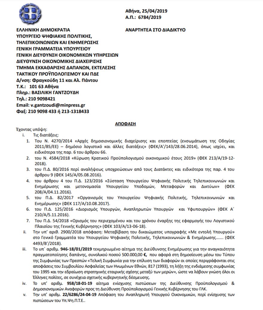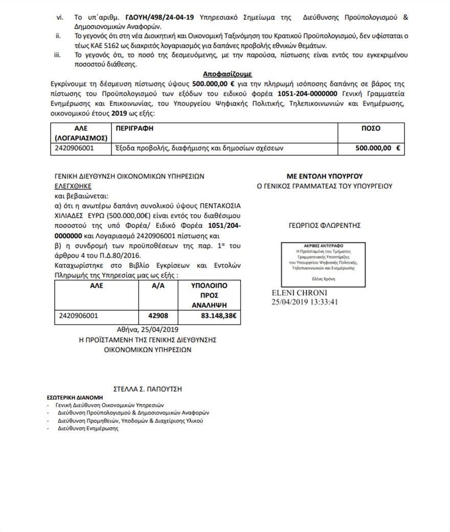 ευρώ για την πραγματοποίηση ισόποσης δαπάνης προβολής. Πρόκειται για την υλοποίηση “τεκμηριωμένου αιτήματος της Διεύθυνσης Ενημέρωσης για την αναγκαιότητα πραγματοποίησης δαπάνης, συνολικού ποσού 500.000ευρώ, που αφορά στη δημοσίευση μέσω του Τύπου της Συμφωνίας των Πρεσπών ‘Τελική Συμφωνία για την επίλυση των διαφορών οι οποίες περιγράφονται στις αποφάσεις του Συμβουλίου Ασφαλείας των Ηνωμένων Εθνών, 817(1993), τη λήξη της ενδιάμεσης συμφωνίας του 1995 και την εδραίωση στρατηγικής εταιρικής σχέσης μεταξύ των μερών’, ώστε να λάβουν γνώση όλοι οι Ελληνες πολίτες, σε συνέχεια σχετικής κυβερνητικής δέσμευσης”.