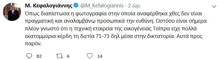 «Όπως διαπίστωσα, η φωτογραφία στην οποία αναφέρθηκα χθες δεν είναι πραγματική, και αναλαμβάνω προσωπικά την ευθύνη. Ωστόσο είναι σήμερα πλέον γνωστό, ότι η τεχνική εταιρεία της οικογένειας Τσίπρα είχε πολλά εκατομμύρια κέρδη τη διετία 71-73 δηλ. μέσα στην δικτατορία. Αυτά προς παρόν» έγραψε σε ανάρτησή του στο Twitter ο Μανώλης Κεφαλογιάννης.
